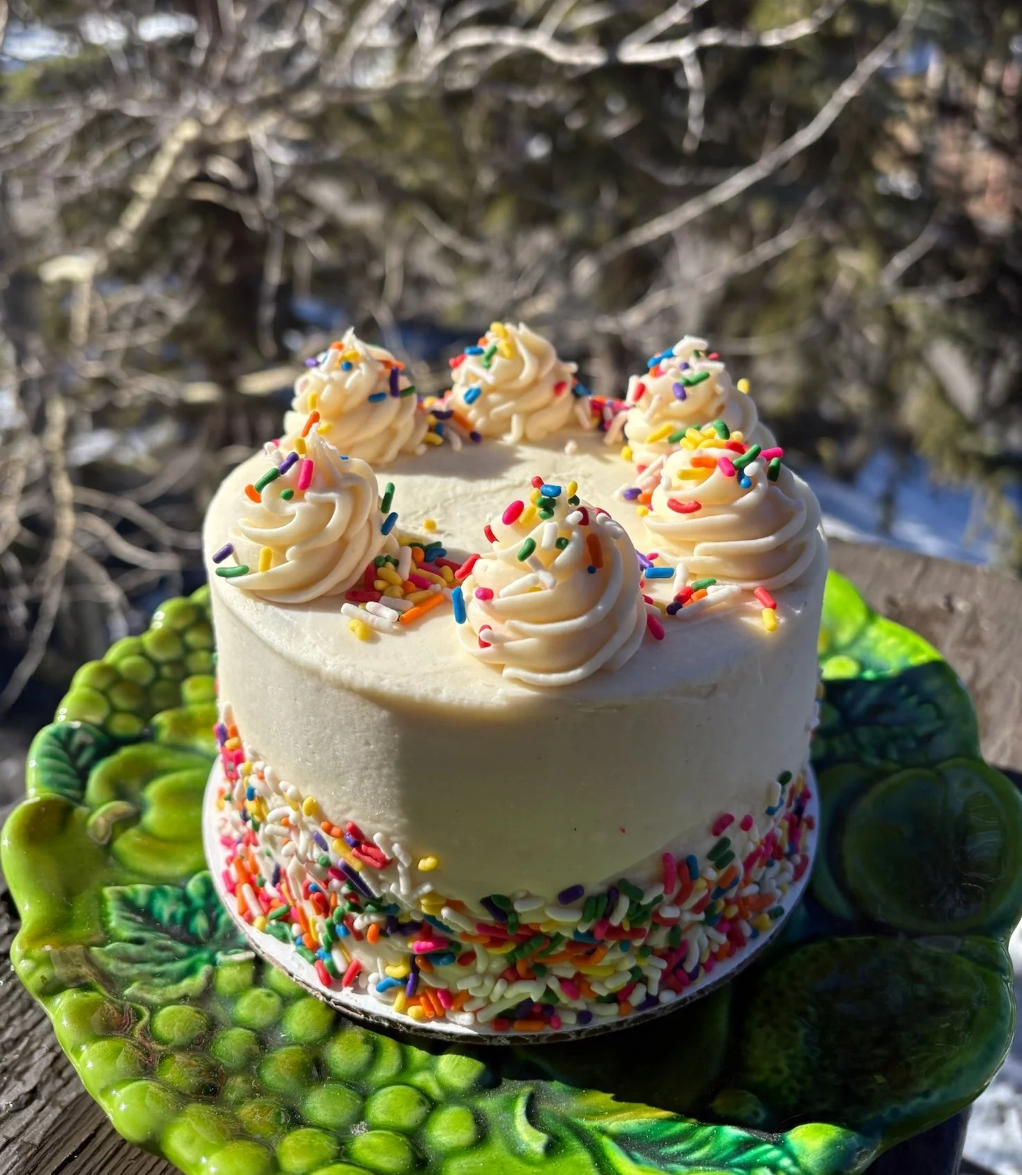 “I woke up on my 23rd birthday to the most delicious lemon poppy seed birthday cake I’ve ever eaten. Yes…I ate it for breakfast, it was just that good!!! The Yellow Mushroom Cake had a creamy lemon frosting and the cake itself was dense but light in the same. AND did I mention it was entirely vegan?!?! The moss was made from crumbled cake bits and the mushrooms were made from safe to eat colored fondant. The flowers were just the perfect add on —which truly brought nature to life in this piece. All I’m saying is, Julia makes the best cakes, especially the vegan ones!! She isn’t only a baker she is an artist. Also, enjoy looking at the Chocolate Log Cake she made for my 22nd birthday. Julia is now the person I call when I want a cake or even a delicious snickerdoodle cookie. She never disappoints!”